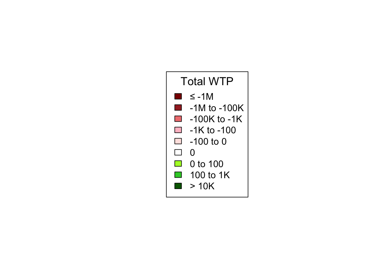 color_palette <-c("≤ -1M"="darkred","-1M to -100K"="brown","-100K to -1K"="lightcoral","-1K to -100"="pink","-100 to 0"="mistyrose","0"="white","0 to 100"="greenyellow","100 to 1K"="limegreen","> 10K"="darkgreen")# Create a blank plot canvasplot(NULL, xaxt ="n", yaxt ="n", bty ="n",xlab ="", ylab ="", xlim =c(0, 1), ylim =c(0, 1))# Draw the standalone legendlegend("center",legend =names(color_palette),fill =unname(color_palette),bty ="o", # border around legendcex =1.0, # text sizetitle ="Total WTP",title.cex =1.2, # title sizencol =1,xpd =TRUE)