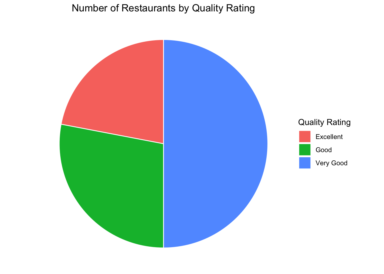 # Summarize number of restaurants by quality ratingrestaurant_counts <- restaurants %>%group_by(`Quality Rating`) %>%summarise(Count =n(), .groups ="drop")# Create pie chartggplot(restaurant_counts, aes(x ="", y = Count, fill =`Quality Rating`)) +geom_col(width =1, color ="white") +coord_polar(theta ="y") +theme_void() +# removes axes and backgroundlabs(title ="Number of Restaurants by Quality Rating",fill ="Quality Rating") +theme(plot.title =element_text(hjust =0.5))