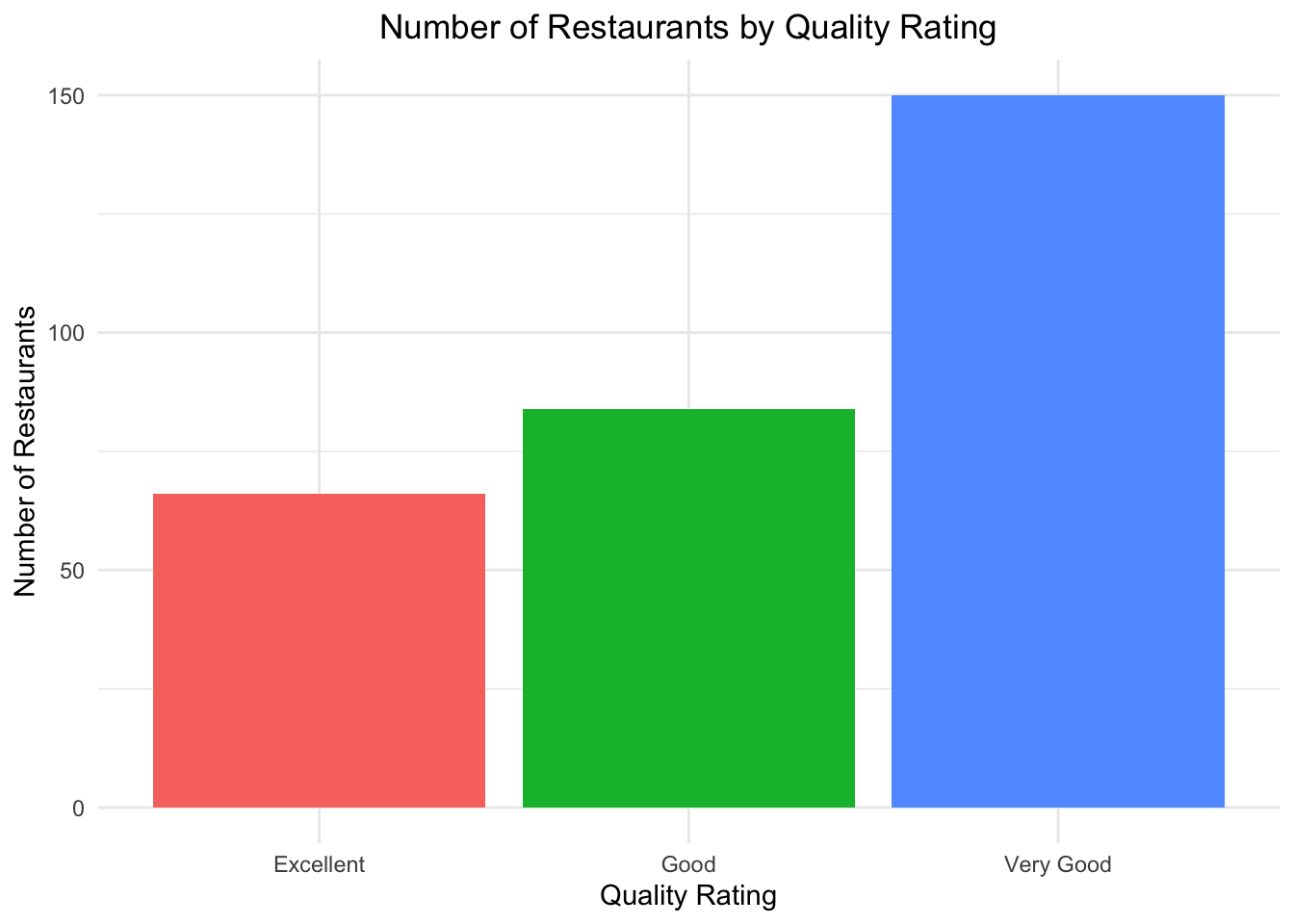 # Create bar plotggplot(restaurant_counts, aes(x =`Quality Rating`, y = Count, fill =`Quality Rating`)) +geom_bar(stat ="identity") +labs(title ="Number of Restaurants by Quality Rating",x ="Quality Rating",y ="Number of Restaurants" ) +theme_minimal() +theme(legend.position ="none", plot.title =element_text(hjust =0.5))