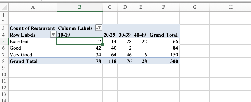 # Step 1: Bin the Meal Price into $10 binsrestaurants_binned <- restaurants %>%mutate(PriceBin =cut(`Meal Price ($)`,breaks =seq(0, max(`Meal Price ($)`) +10, by =10),include.lowest =TRUE,right =FALSE# e.g., [10,20) ) )# Step 2: Count of restaurants by Quality Rating and Price Binpivot_table <- restaurants_binned %>%group_by(`Quality Rating`, PriceBin) %>%summarise(RestaurantCount =n(), .groups ="drop") %>%pivot_wider(names_from = PriceBin, values_from = RestaurantCount, values_fill =0)# View the resultprint(pivot_table, width =Inf)