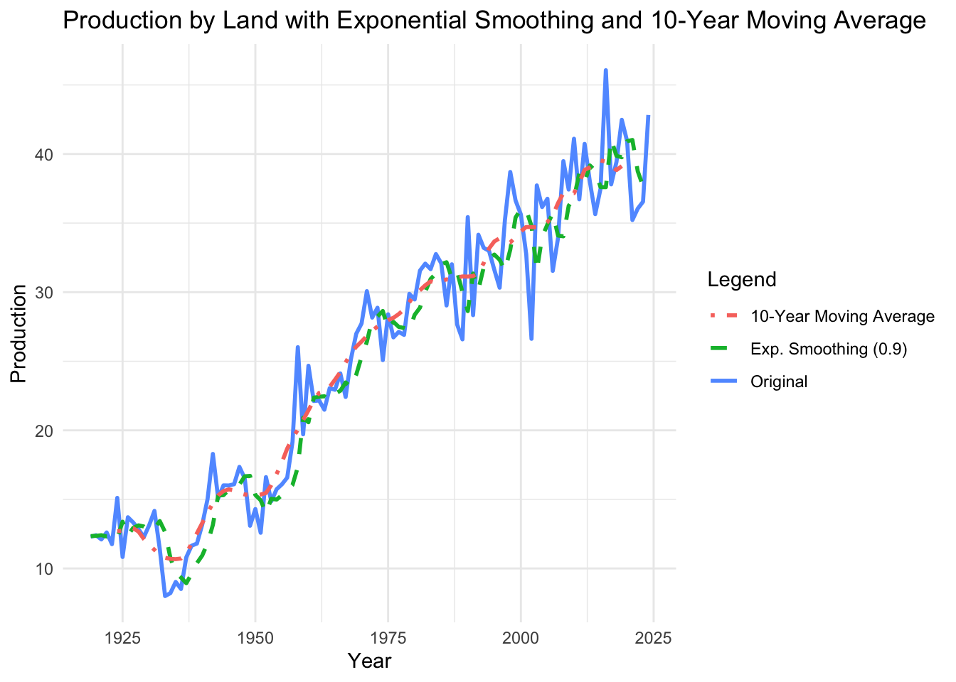 ggplot(croptimeseries, aes(x = Year)) +# Make sure 'Year' exists and is correctgeom_line(aes(y = production_byland, color ="Original"), size =1) +geom_line(aes(y = fit_damped_09, color ="Exp. Smoothing (0.9)"), size =1, linetype ="dashed") +geom_line(aes(y = ma_10yr, color ="10-Year Moving Average"), size =1, linetype ="dotdash") +labs(title ="Production by Land with Exponential Smoothing and 10-Year Moving Average",x ="Year",y ="Production",color ="Legend") +theme_minimal()